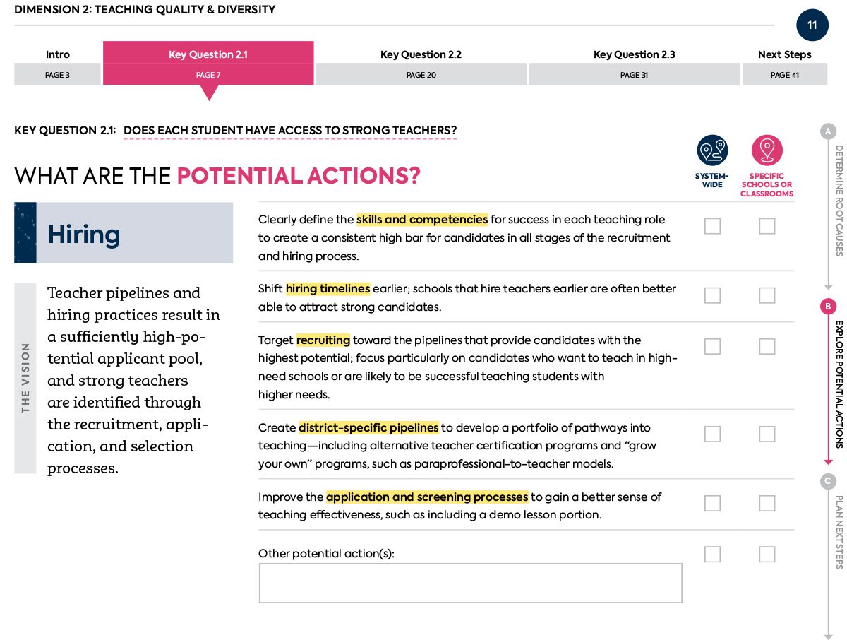 This interactive workbook provides a structure to help your team better understand what is causing challenges related to Teaching Quality & Diversity and identify concrete next steps for improving the experiences that students have in school.